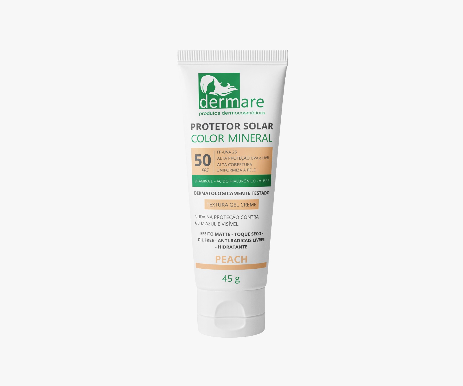 O Protetor Solar Peach Dermare FPS 50 oferece alta proteção contra os raios UVA e UVB, com cobertura suave de cor pêssego, que uniformiza o tom da pele e disfarça imperfeições sem pesar. Com textura leve, toque seco e rápida absorção, é ideal para o uso diário, inclusive em peles oleosas ou acneicas.